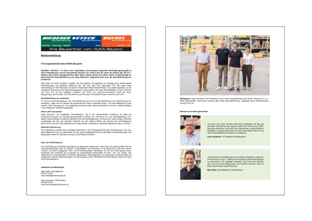 Altstätten / Rebstein – Im Sinne einer langfristigen und strategisch geplanten Nachfolgeregelung gibt es beim HUKA-Baupool mit den Baupartnern Niederer AG, Vetsch Bau AG sowie der Büchel Bau AG ab 1. Oktober 2023 einen Führungswechsel. Marc Söldi, welcher bereits seit vielen Jahren im Betrieb tätig ist, übernimmt die Geschäftsführung von Hugo Kaufmann. Ergänzend wird auch die Geschäftsleitung neu strukturiert.